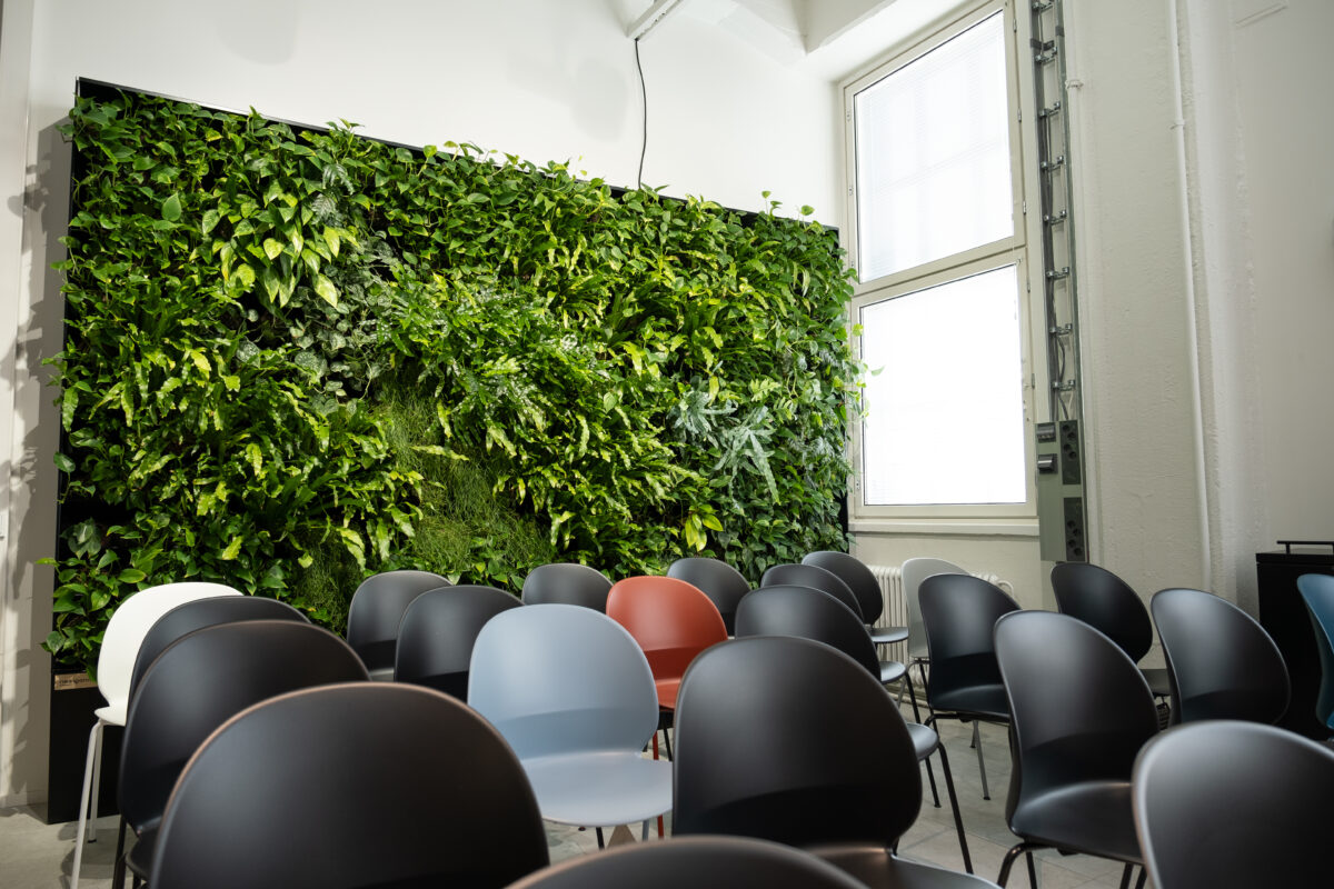 Toiseksi, viherseinän kokoa suunniteltaessa tulee huomioida sisätilan koko. Kasvit vapauttavat kosteutta huoneilmaan myös öisin, jolloin tilojen ilmastointi on usein pois päältä tai ainakin pienemmällä teholla. Emme suosittele sijoittamaan viherseinää aivan ulko-oven viereen kylmän talvi-ilman vuoksi. Näitä ei onneksi kuitenkaan tarvitse muistaa itse, vaan osaavat suunnittelijamme huomioivat tilan ominaisuudet ja mahdolliset haasteet.